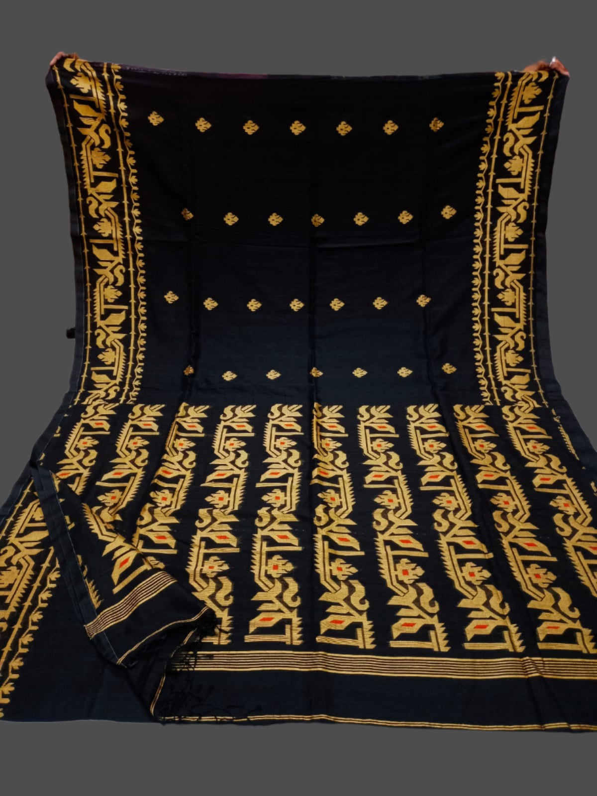 This exquisite Mal Cotton Jamdani Handwork saree is meticulously crafted with intricate details. Made from premium quality cotton, it offers a delicate and luxurious feel. The traditional handwork adds a touch of elegance, making it the perfect choice for any occasion. Elevate your wardrobe with this timeless piece.