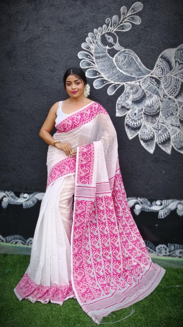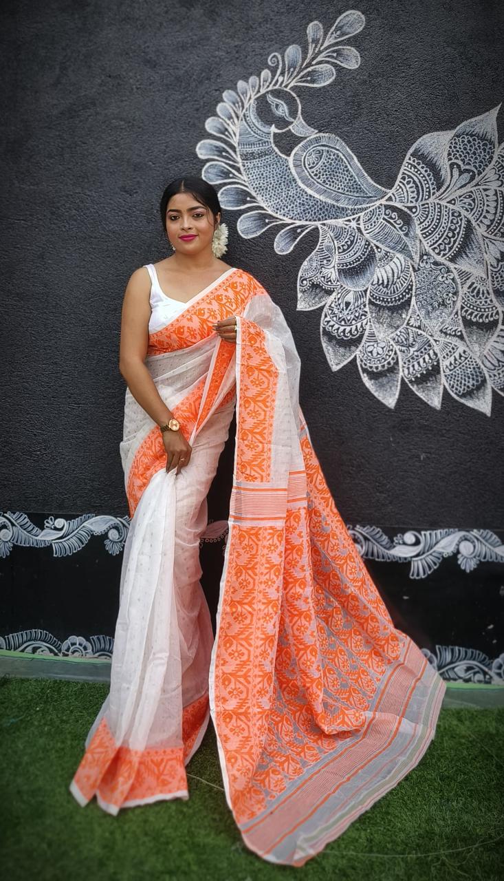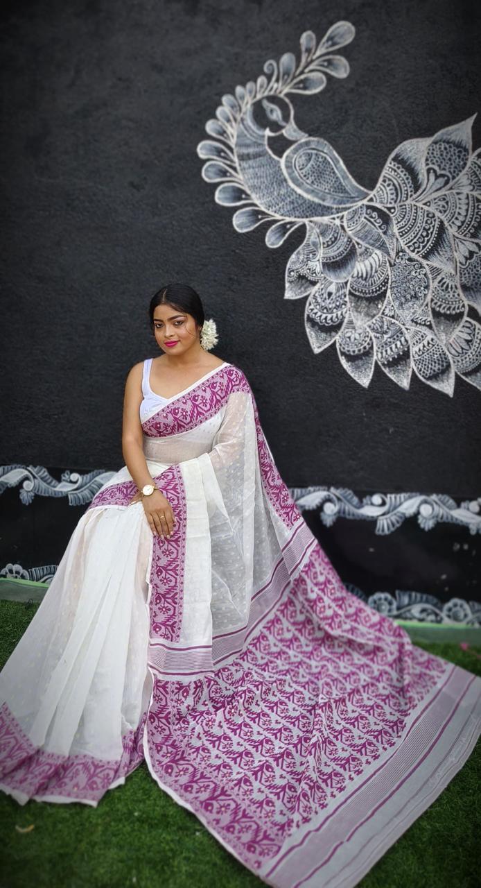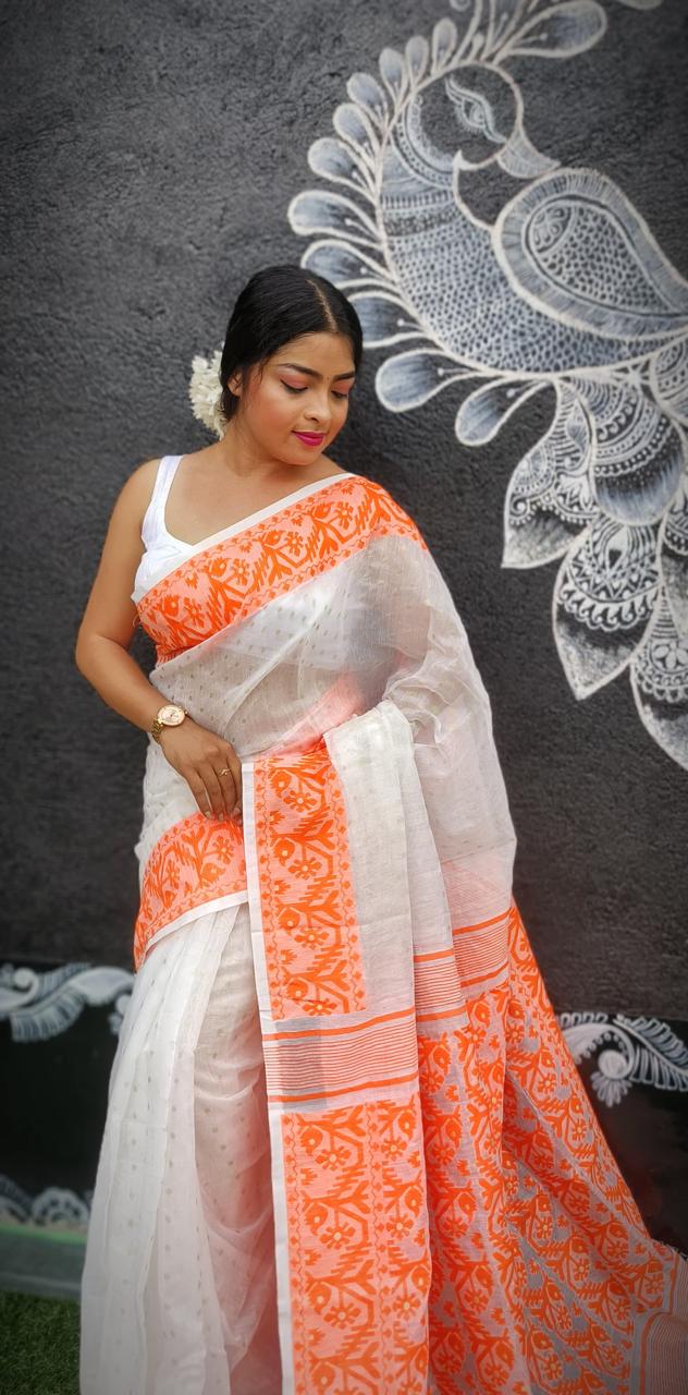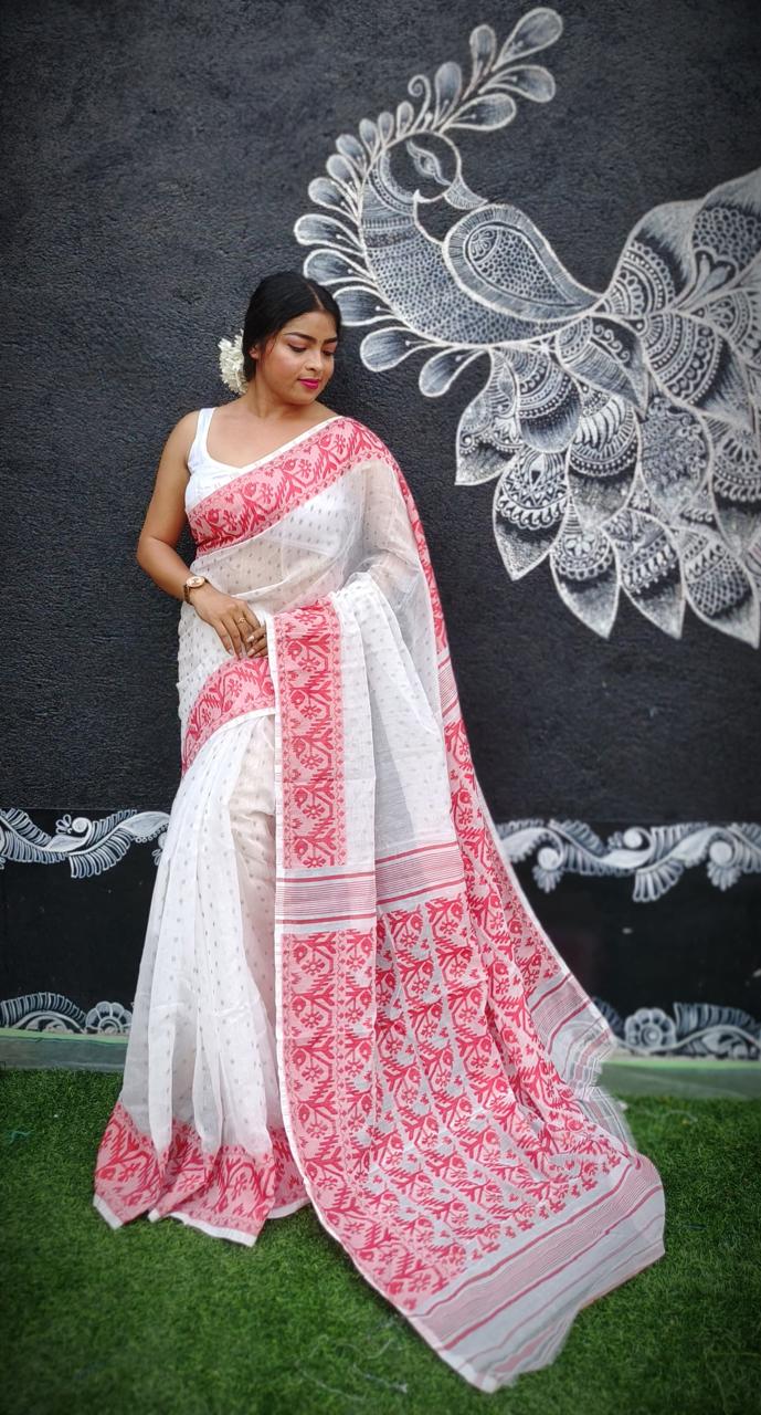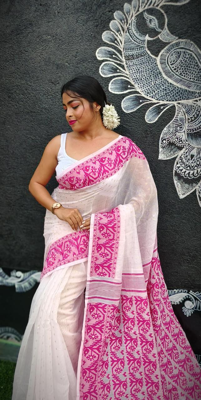 Crafted with precision and expertise, our Soft Jamdani saree is a luxurious blend of comfort and elegance. Made from the finest materials, it drapes beautifully and feels soft against the skin. Elevate your saree collection with this must-have piece that exudes sophistication and style.